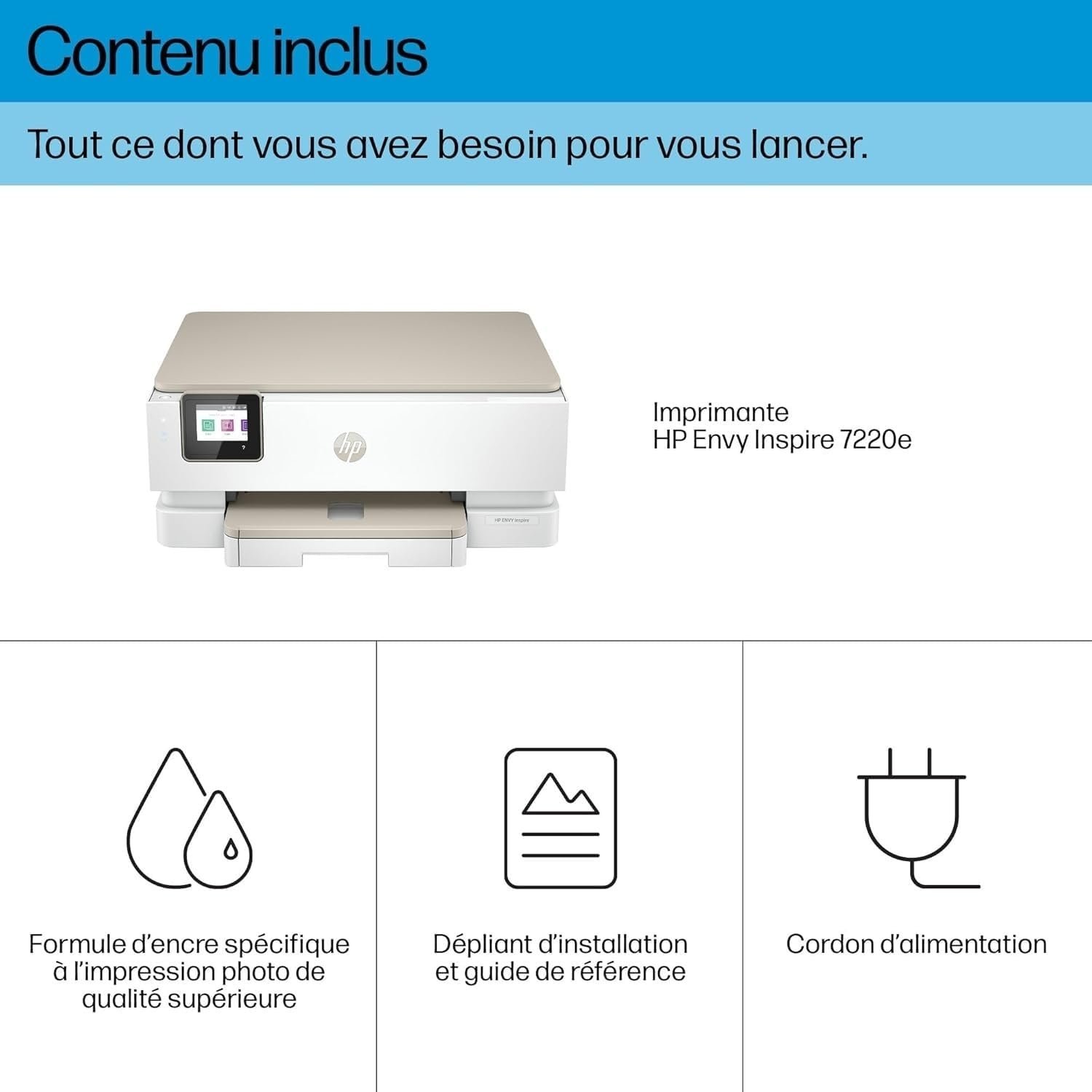 La HP ENVY Inspire 7220e est une imprimante tout-en-un (impression, scan, copie) conçue pour la famille et le télétravail. Elle se distingue par sa polyvalence exceptionnelle : elle imprime aussi bien des documents administratifs nets que des photos éclatantes grâce à son bac papier photo dédié.