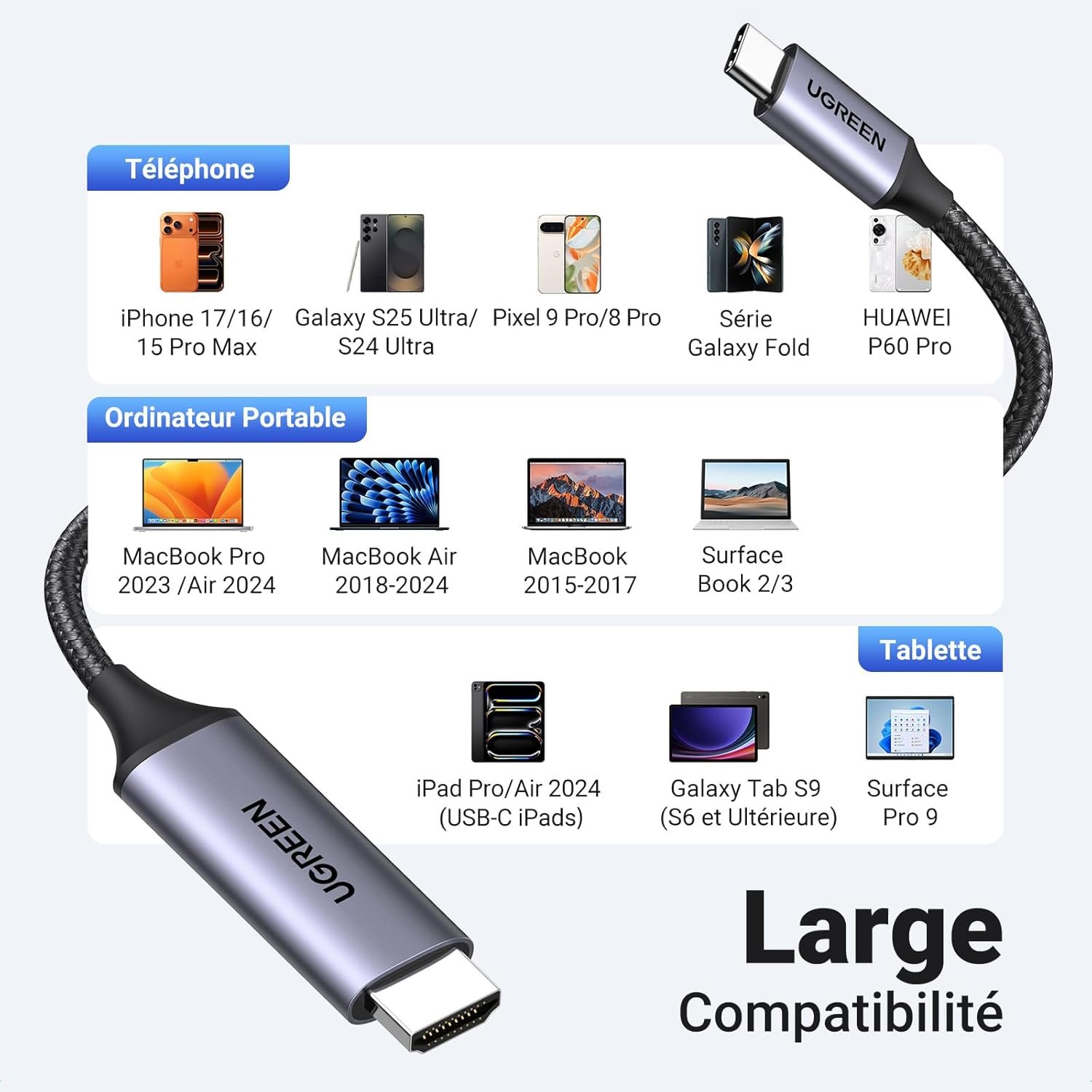 • Compatibilité Étendue : Fonctionne avec tous les ports USB Type-C supportant le « DisplayPort Alt Mode ».