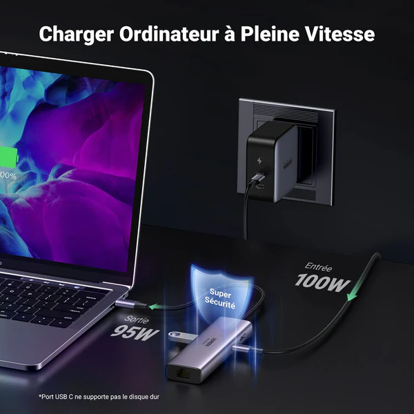 • Charge rapide 100W : Le port PD (Power Delivery) permet de recharger votre ordinateur portable à pleine vitesse tout en utilisant vos périphériques.