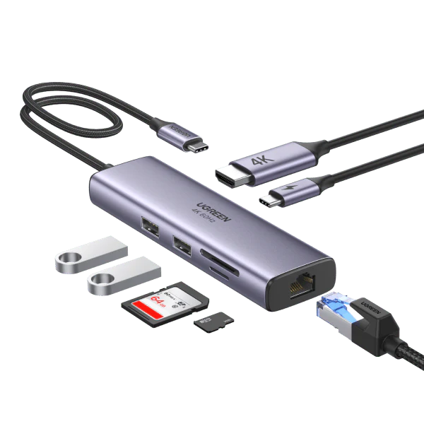 Hub USB-C 7-en-1 UGREEN (15214) : Étendez votre connectivité avec HDMI 4K, 3 ports USB 3.0, recharge 100W et lecteurs SD/TF. Design aluminium robuste. Disponible à Douala !