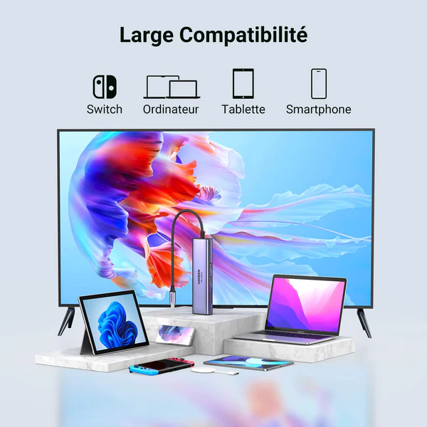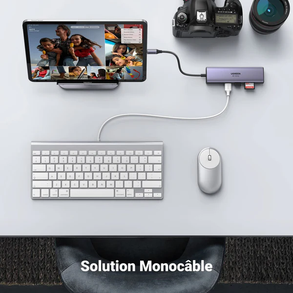 Donnez une nouvelle dimension à votre ordinateur avec le Hub UGREEN 15214. Compact, élégant et ultra-performant, il transforme votre unique port USB-C en une station de travail complète, parfaite pour le bureau comme pour les déplacements.